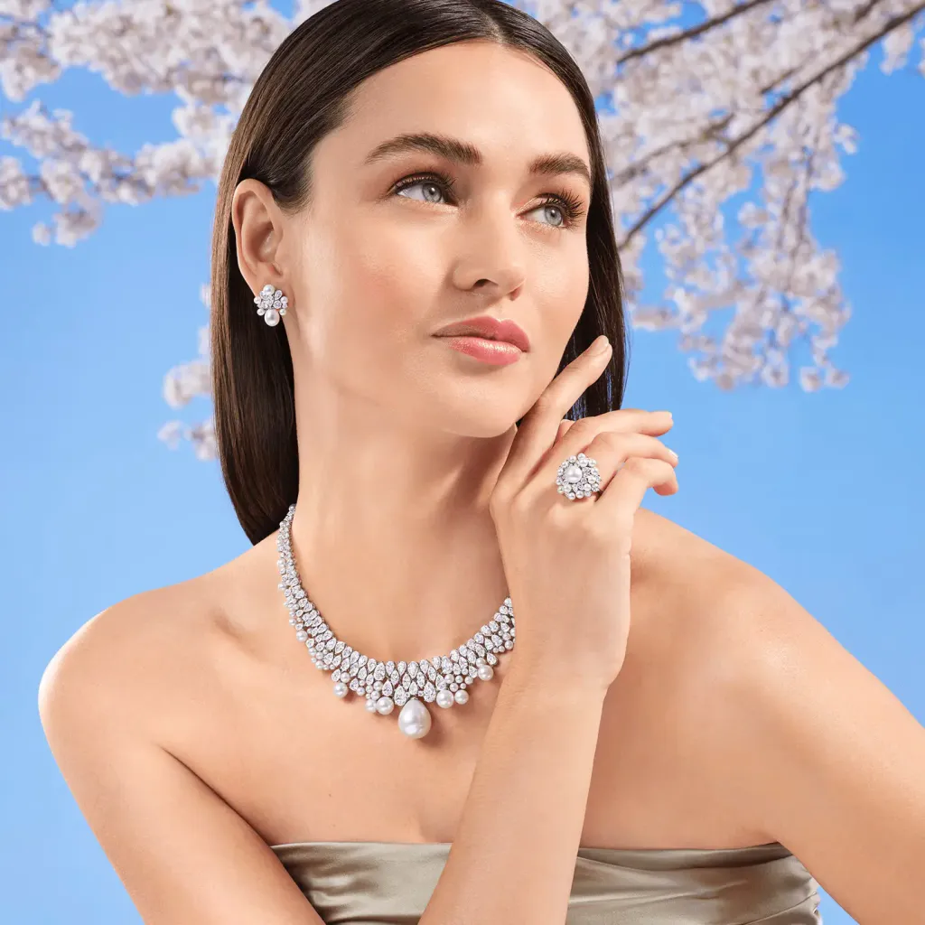 The brilliance doesn’t stop there. Pear-shaped, marquise and round brilliant diamonds add an icy sparkle, reminiscent of frost on a crisp winter morning. Handcrafted with South Sea, Keshi, and Akoya pearls, the Mount Fuji Necklace showcases unparalleled artistry, blending classic craftsmanship with modern sophistication. It’s more than just a piece of jewelry; it’s a celebration of nature’s grandeur and a testament to high jewelry design.