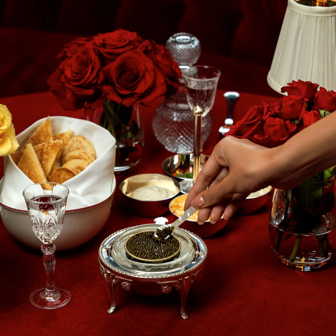 Signature dishes include baked potato with caviar, blinis topped with the finest roe, and smoked salmon platters, all paired with premium champagne or vodka for a truly exotic experience.