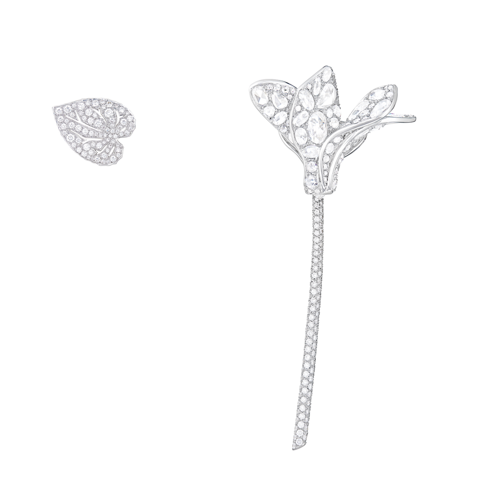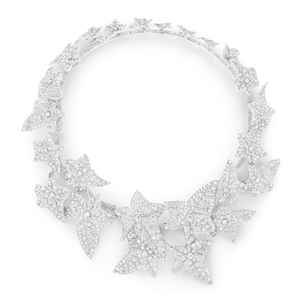 Airelles Necklace – Inspired by lingonberries, this diamond-encrusted necklace features detachable stems that can transform into a cascading brooch or smaller pins. The specialized setting allows each stem to adjust naturally to the body outline.