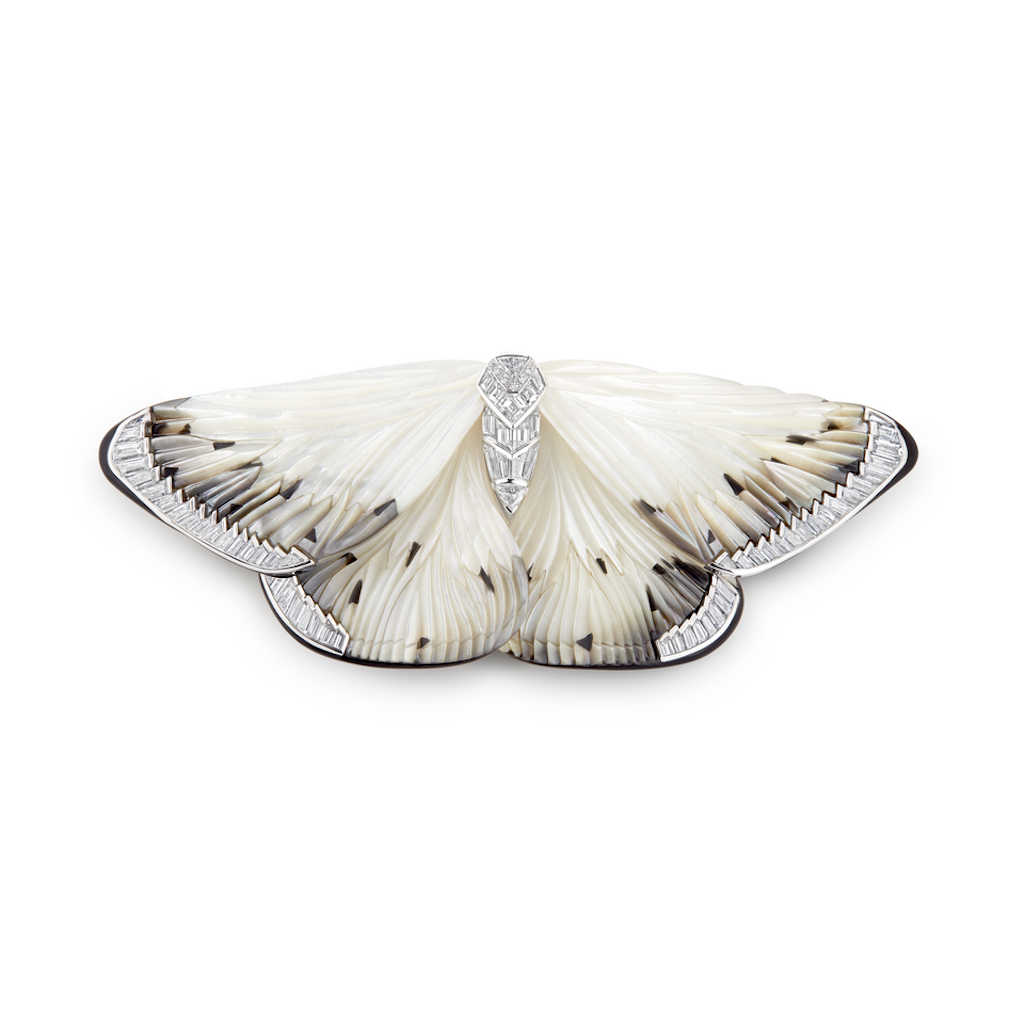 Papillon de Nuit Brooch – A moth-inspired brooch and hairpiece made from mother-of-pearl and diamonds. The wings are hand engraved for a lifelike texture, appearing to swing with every movement.
