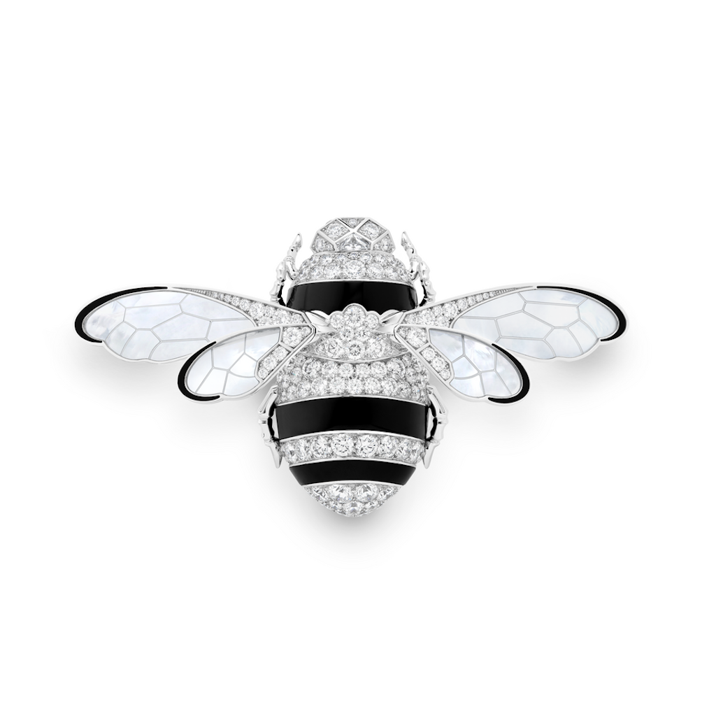 Bourdon Ring – A bumblebee set with onyx, diamonds, and mother-of-pearl, featuring a hidden mechanism that allows the wings to shift as though in flight.