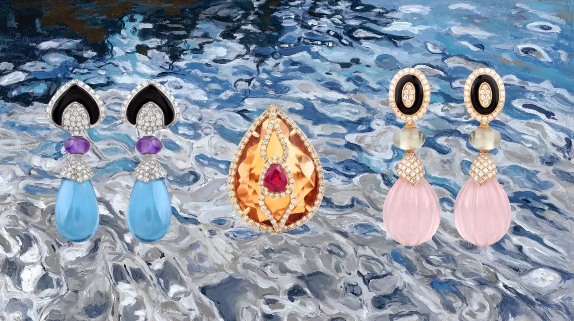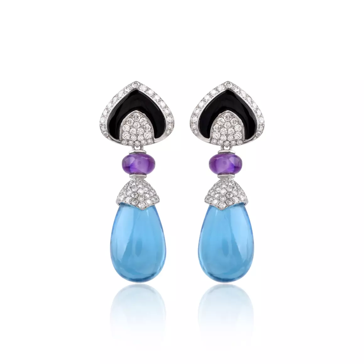 These Ganga earrings capture the essence of the Goddess of purification, embodying her beauty and grace. Set in 18K white gold, the 48-carat blue topaz mirrors the calming flow of the Ganges, while the 2.8-carat amethyst adds a touch of elegance. With 1.580 carats of diamonds, these $4,450 earrings blend luxury, sophistication, and natural charm, paying tribute to Ganga’s divine role in Hindu mythology as the purifier and mother of Bhishma.