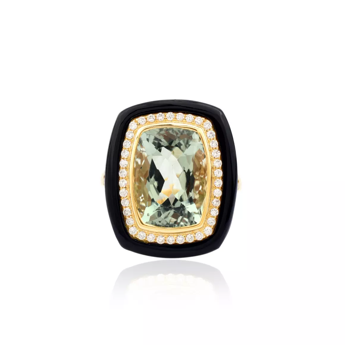 Inspired by Arjuna, the heroic warrior of the Mahabharata, this 18K yellow gold Arjuna ring embodies courage and wisdom. The central 8.590-carat green tourmaline symbolizes elegance, while black onyx and diamonds represent strength. Priced at $4,220, this piece captures Arjuna’s devotion, righteousness, and legendary power in a timeless design.