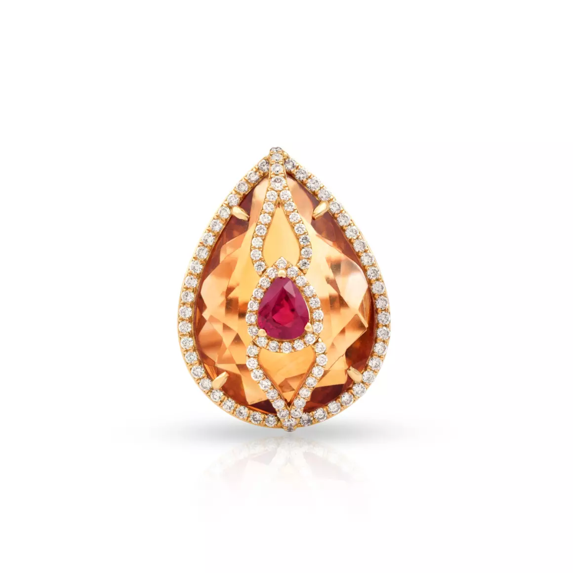 Radiating the brilliance of the Sun God Surya, the Surya ring captures the essence of his light, energy, and authority in the Mahabharata Jewelry Collection. Crafted in 18K yellow gold, it has a radiant 10.160-carat citrine that reflects the warmth of the sun, together with a striking central ruby drop and a diamond halo. This eye-catching piece, priced at $2,290, pays tribute to the Mahabharata deity symbolizing the dispeller of darkness and the source of life’s vitality.