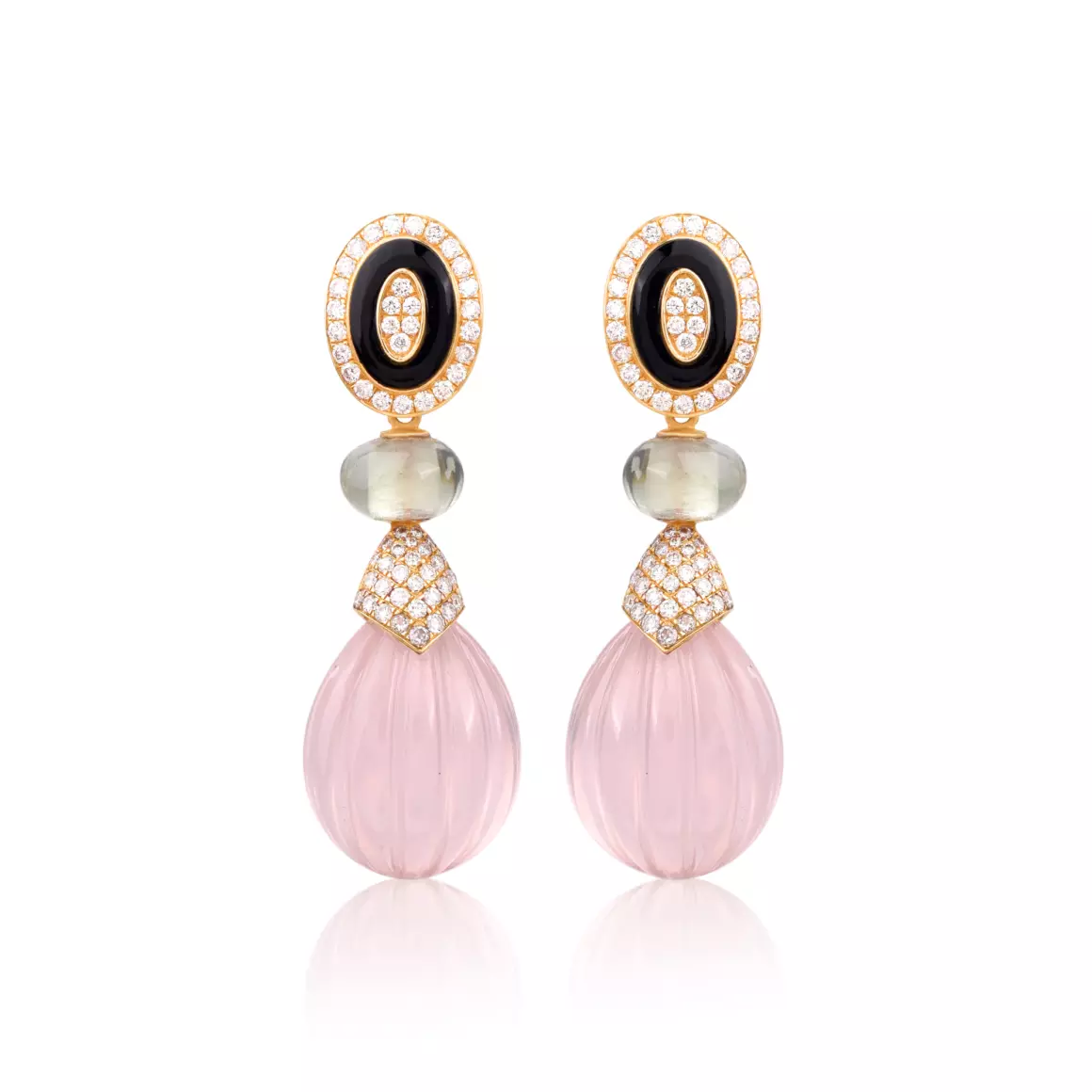 These Satyavati earrings radiate timeless elegance, drawing from the strength and grace of Queen Satyavati. Crafted in 18K yellow gold, they feature 56.700 carats of tender rose quartz, complemented by 1.400 carats of diamonds for a brilliant shine. The addition of black onyx and green amethyst creates a harmonious blend of sophistication and spiritual strength. Priced at $4,200, these earrings encapsulate the regal beauty and resilience of one of the Mahabharata’s most revered figures.