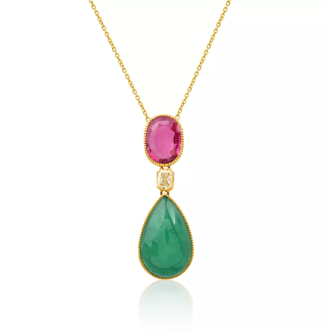 Building on the timeless narratives of the Mahabharata, this exquisite Kunti necklace draws inspiration from Kunti, a figure of resilience and divine grace. Crafted in 18K yellow gold, it features a captivating 13.290-carat emerald and a vibrant pink tourmaline, symbolizing her unwavering virtue and maternal strength. Accented with delicate diamonds, this $7,900 piece captures the essence of one of the epic’s most iconic women, blending elegance with a profound story.