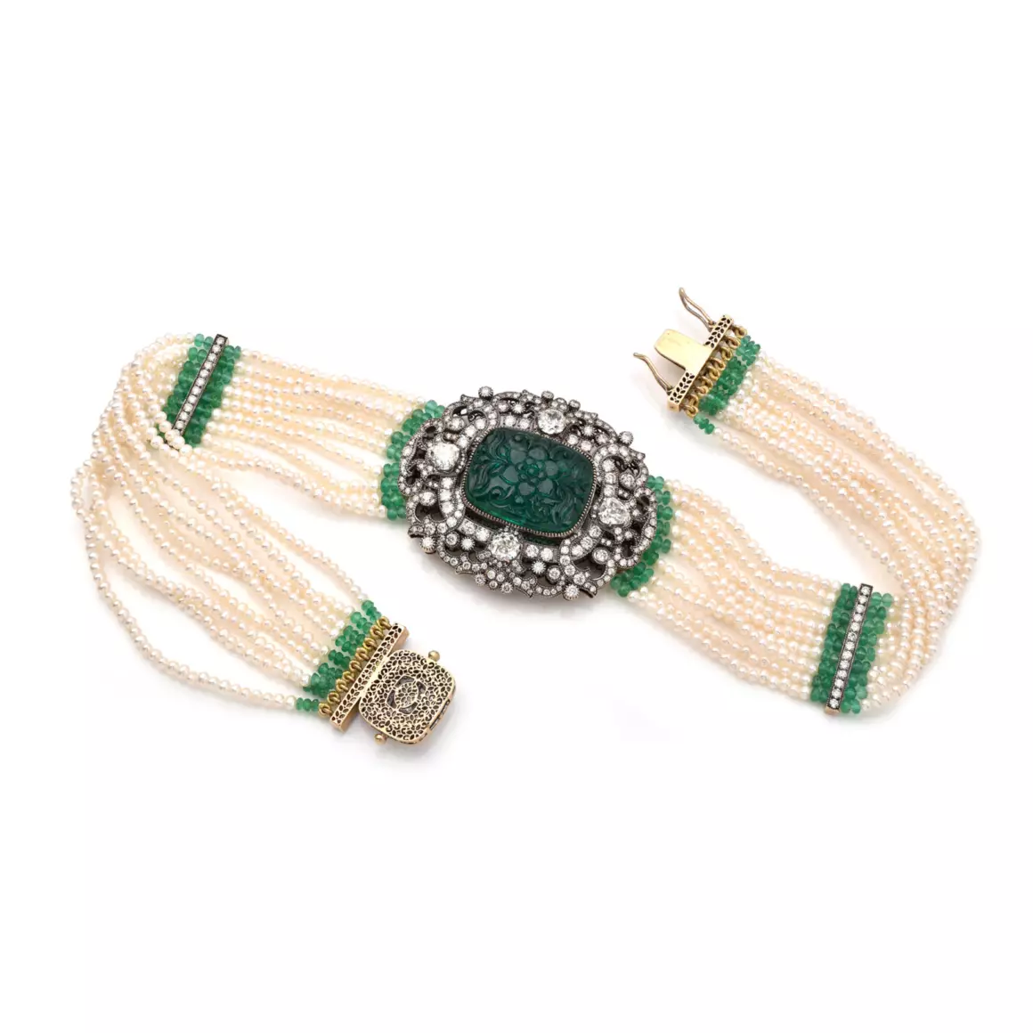 Inspired by Krishna, the divine guide and symbol of love in the Mahabharata, this Krishna choker necklace embodies his teachings and spiritual essence. Krishna’s wisdom and blessings are reflected in the central emerald, which is regarded as a stone of enlightenment. Paired with luminous pearls and radiant diamonds, each element tells a tale of compassion, protection, and divine connection. Priced at $28,300, it’s a wearable tribute to one of India’s most cherished deities.