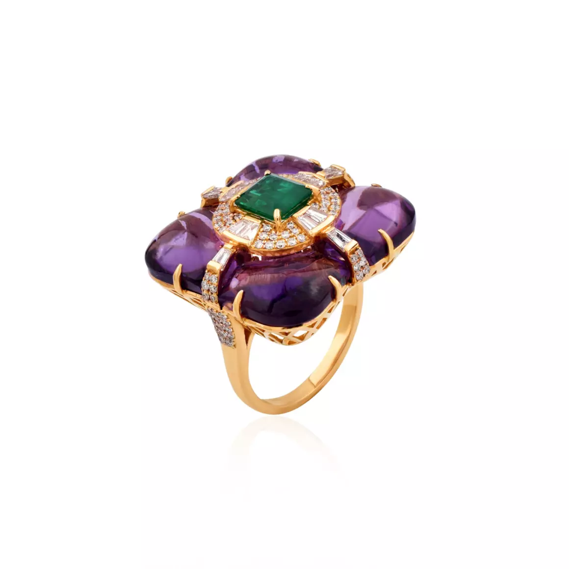 Inspired by Draupadi, the embodiment of beauty, strength, and resilience in the Mahabharata Jewelry Collection, this Draupadi ring reflects her multifaceted character. The enchanting 1.060-carat emerald in its heart is surrounded by 12.620 carats of amethyst, which add depth and mystery to this 18K yellow gold masterpiece. Accented with sparkling diamonds, this $5,100 piece is a tribute to a woman who was an incarnation of goddesses Kali and Parvati, blending feminine charm with divine strength in every detail.