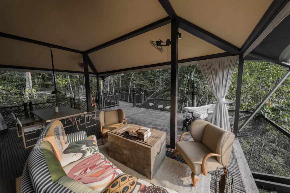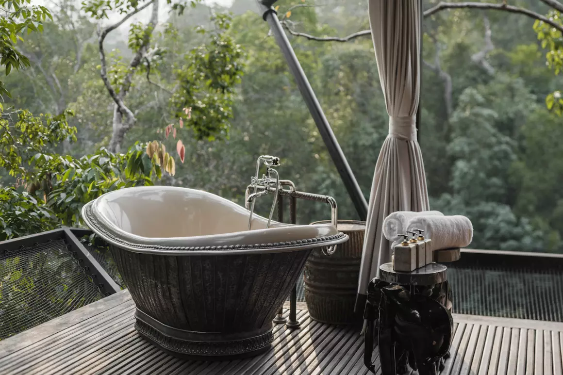 My tented villa was tucked beside the river and a waterfall, a sanctuary that felt both completely open to nature and impossibly luxurious. A vintage king-sized bed, handcrafted furniture, and a safari-style shower gave it warmth and character. A spacious private deck with a dining zone and a telescope felt cozy and a perfect strategic point, from where I could watch birds flutter and monkeys leap in the early morning light.