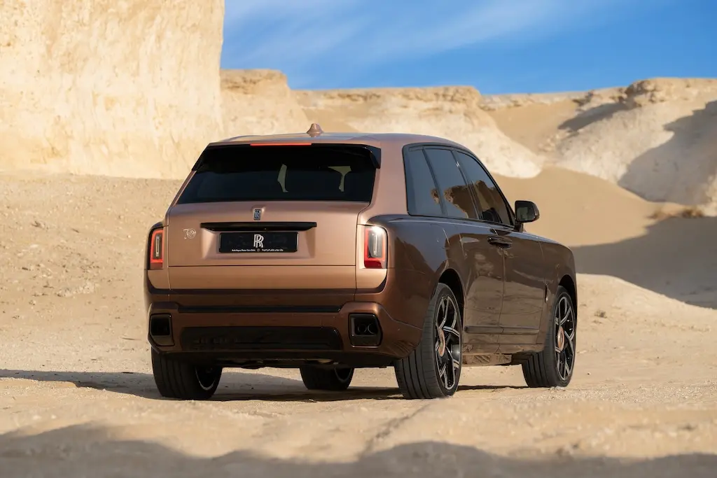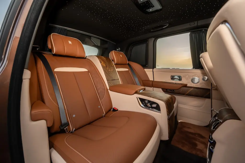 The exterior is an immediate statement. A two-tone scheme pairs Bronze with Sunrise Sparkle, a finish that seems to refract light much like the Qatari capital at dusk—where glass towers and desert sands converge in golden brilliance. The Cullinan’s commanding silhouette gains a new layer of elegance under this chromatic interplay, reminding us why Black Badge clients seek distinction not in excess, but in precision.