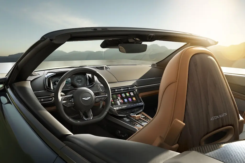 Both models wear Pentland Green paint beneath a Westminster Green hood, evoking Aston Martin’s racing heritage with modern restraint. Inside, tri-tone leather in Centenary Saddle Tan, Ivory, and Woven hues wraps around dark walnut veneers and bespoke 60th-anniversary embroidery — a cabin as much atelier as cockpit.