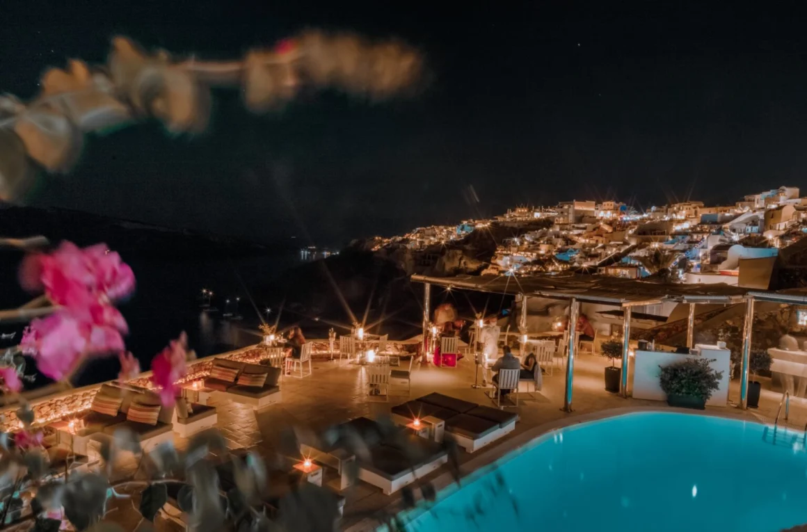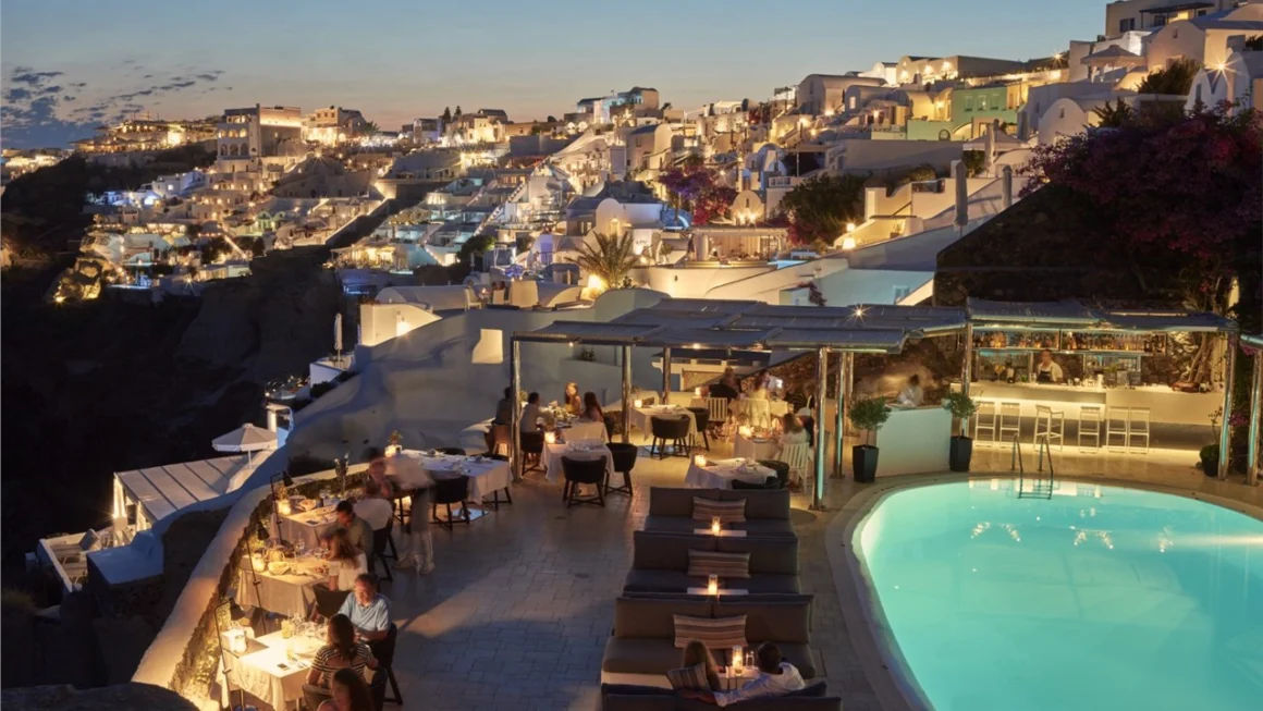 The hotel’s restaurant elevates dining to an art form. With tables overlooking the pool and Caldera, Mediterranean flavors are served with modern finesse, paired with local wines that capture the essence of Santorini. The infinity pool extends toward the Aegean, creating the illusion of water spilling seamlessly into the sea below, while sun loungers and shaded nooks invite languid afternoons under the sun.