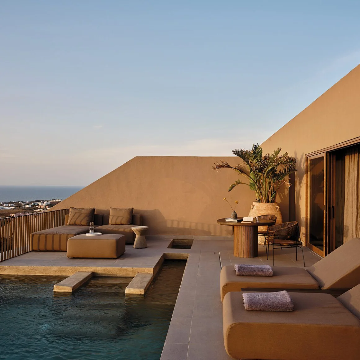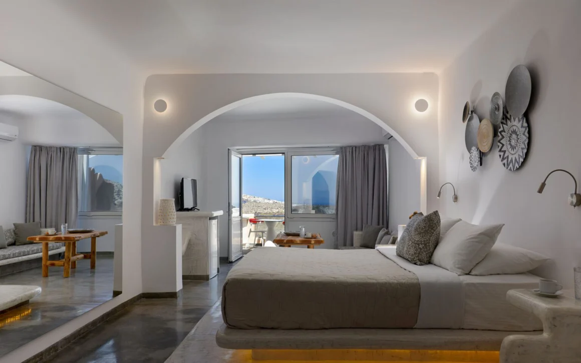 This boutique hotel strikes a perfect balance between intimacy and luxury. Its carefully curated design echoes Cycladic minimalism, with whitewashed walls, natural stone, and warm textures that complement rather than compete with the extraordinary surroundings. Each suite is designed to frame the Caldera, ensuring that the spectacular views are always within reach—whether from a private terrace, a sunbed, or the oversized windows of the living space.