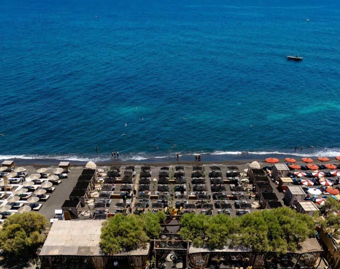 Stylish and effortlessly chic, Forty One 41 Beach Club on Perivolos beach is one of the island’s most fashionable destinations for sun‑drenched indulgence. The setting is superb: black volcanic sand beneath your feet, gentle Aegean waves at your side, and modern loungers stretching out toward the sea in a calm, sophisticated rhythm.