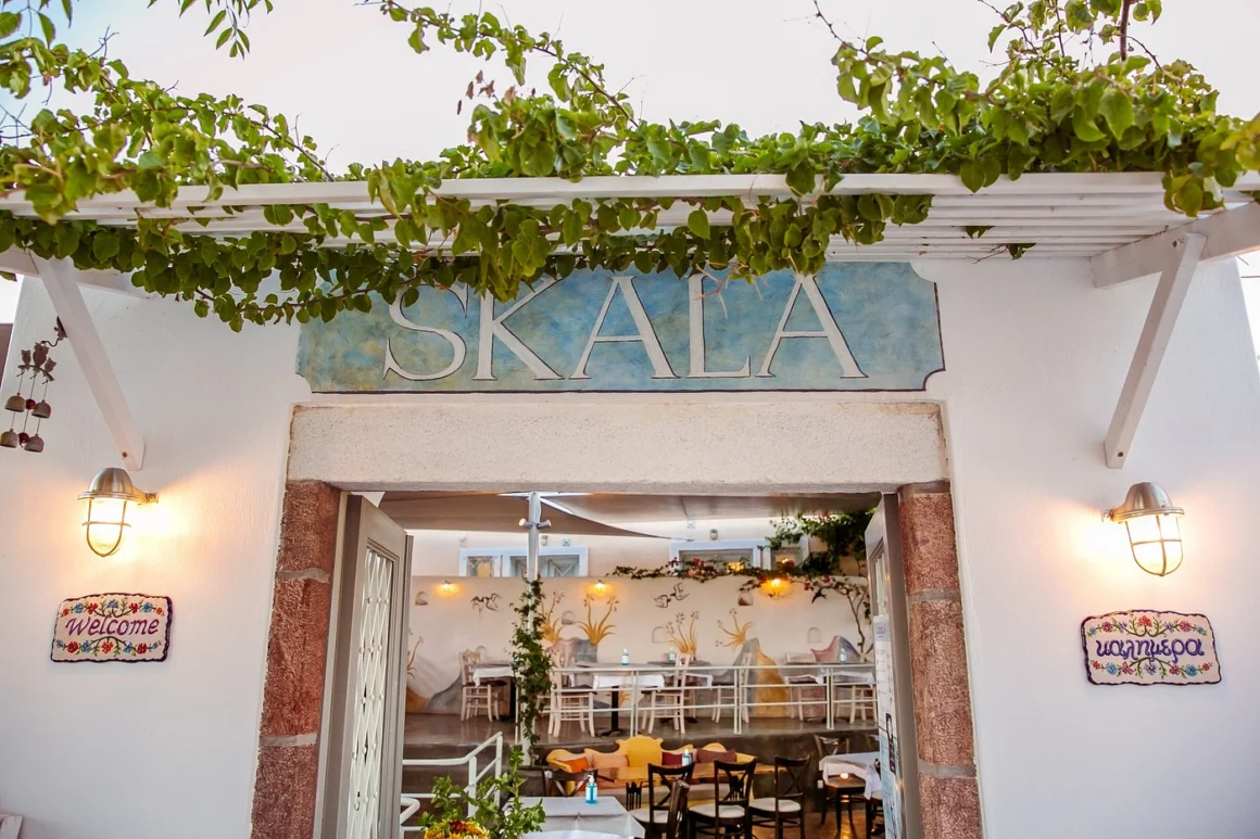 Founded in 1984 and perched on the cliff‑edge of Oia, Skala has quietly become a culinary landmark of Santorini. The name “Skala” — Greek for staircase — nods to the narrow steps that wind down from the village and lead to its expansive terrace, where the Aegean and the island’s caldera spread before you.