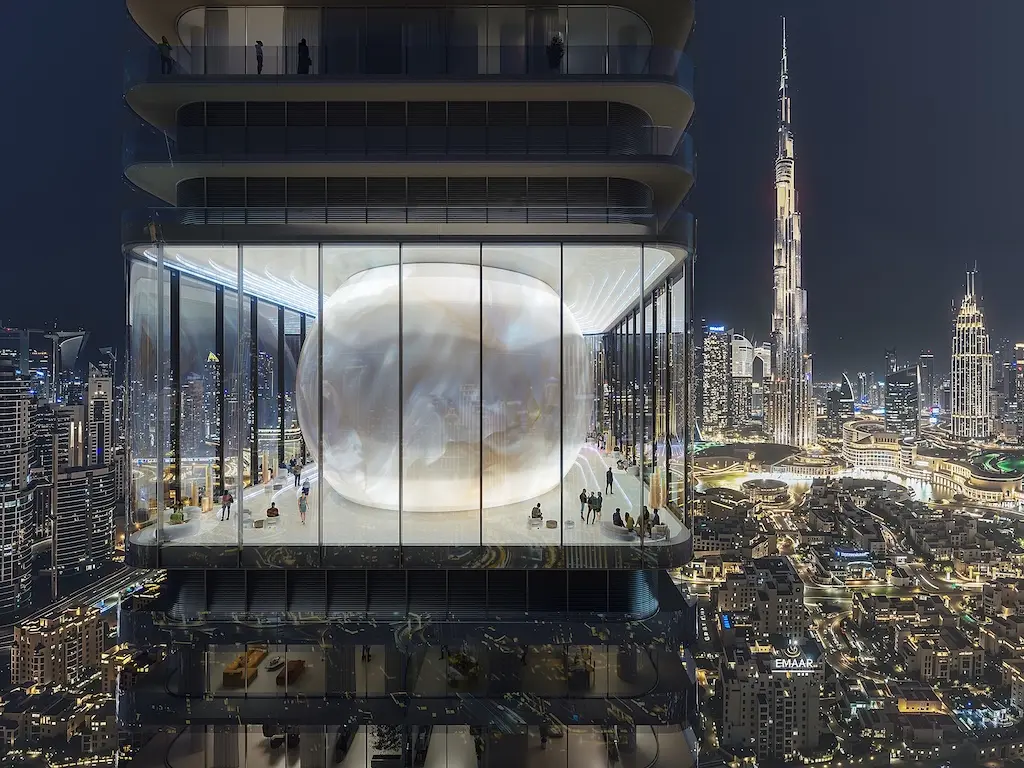 Designed by acclaimed Dutch architectural studio MVRDV, the 42-storey tower rises more than 200 metres above the city, distinguished by its sculptural central orb. This architectural focal point houses a panoramic social and dining destination, offering uninterrupted 360-degree views across Burj Khalifa, Business Bay and Dubai Mall. The building itself mirrors a carefully choreographed journey: from vibrant, city-facing public spaces at ground level to serene, private residential environments higher up — a physical embodiment of movement and recovery.