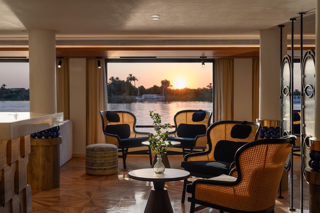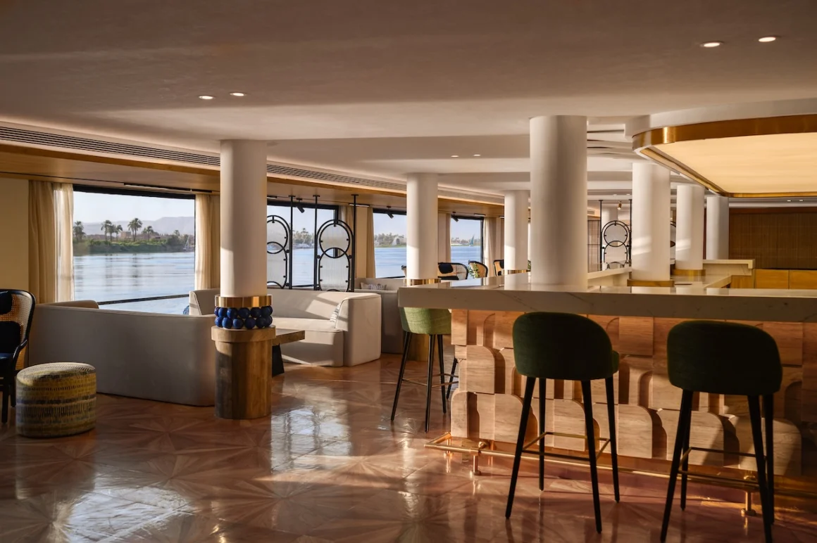 Public spaces are equally striking. The lounge bar, bathed in natural light from large windows, is one of the most beautiful areas on board — a refined blend of modern design and Egyptian-inspired details, perfect for afternoon tea or a pre-dinner drink. Marble surfaces, layered textures, and warm tones create a sense of timeless elegance throughout the ship.