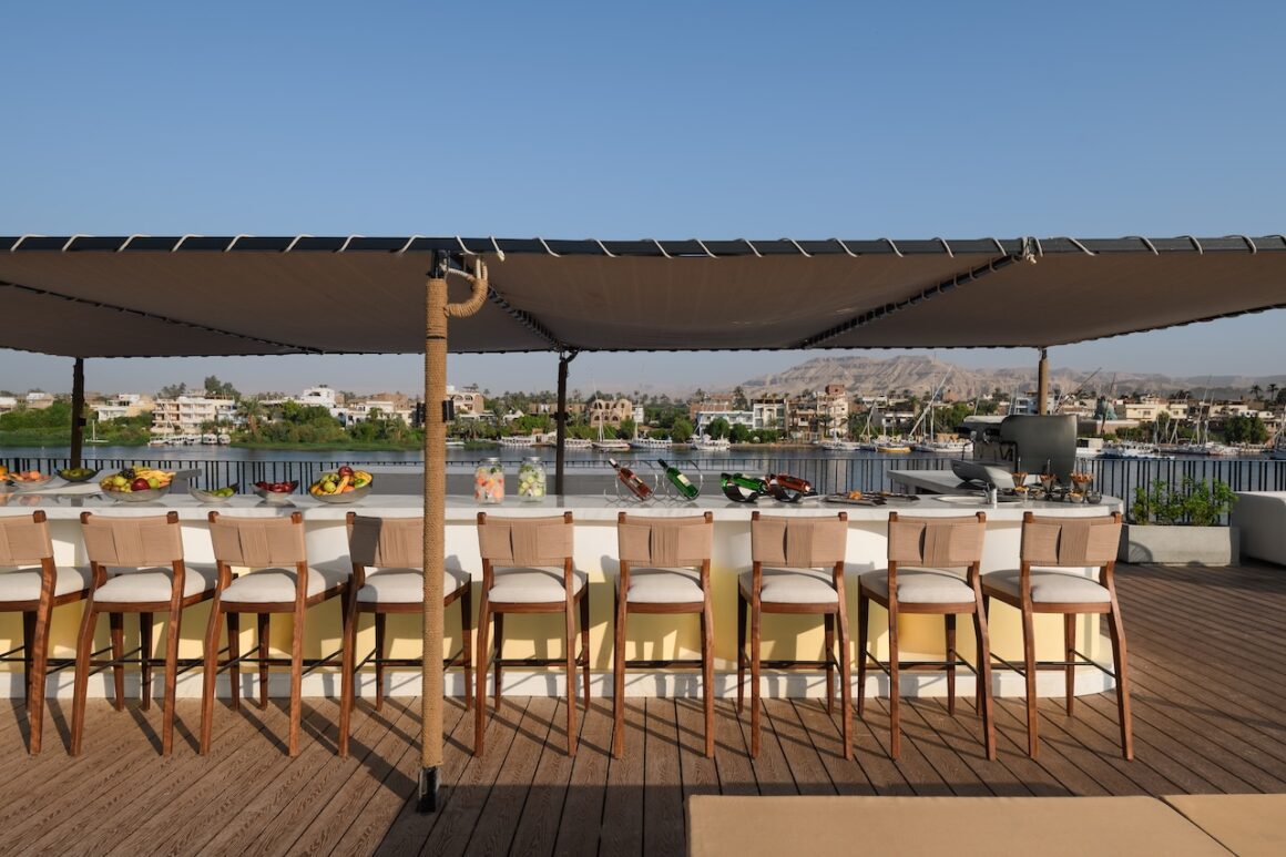 The sundeck is where Soleil Nile Cruise truly comes alive. Here, a beautiful swimming pool and a heated jacuzzi invite guests to relax as the Nile glides by at an unhurried pace. Few experiences rival soaking in the jacuzzi at sunset, the sky shifting from gold to rose to deep indigo, palm-lined banks slipping silently past. The upper-deck bar completes the scene, serving beautifully crafted cocktails — best enjoyed as the sun sinks below the horizon, casting a soft glow across the water.