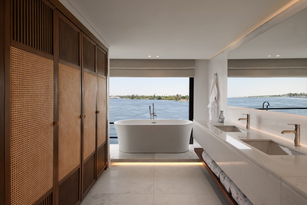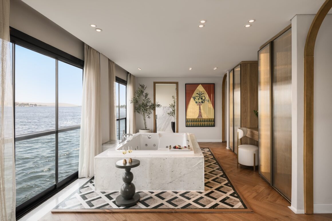 We stayed in a Junior Suite, generously proportioned and beautifully restrained, designed to keep the Nile in constant view. Floor-to-ceiling windows framed the river like a living painting, while the interiors balanced contemporary comfort with subtle Egyptian accents. The marble bathroom was a standout — a deep soaking tub positioned beside a panoramic window, inviting long, unhurried baths as the river drifted past. The gentle sound of water against the hull turned an everyday ritual into something quietly unforgettable.