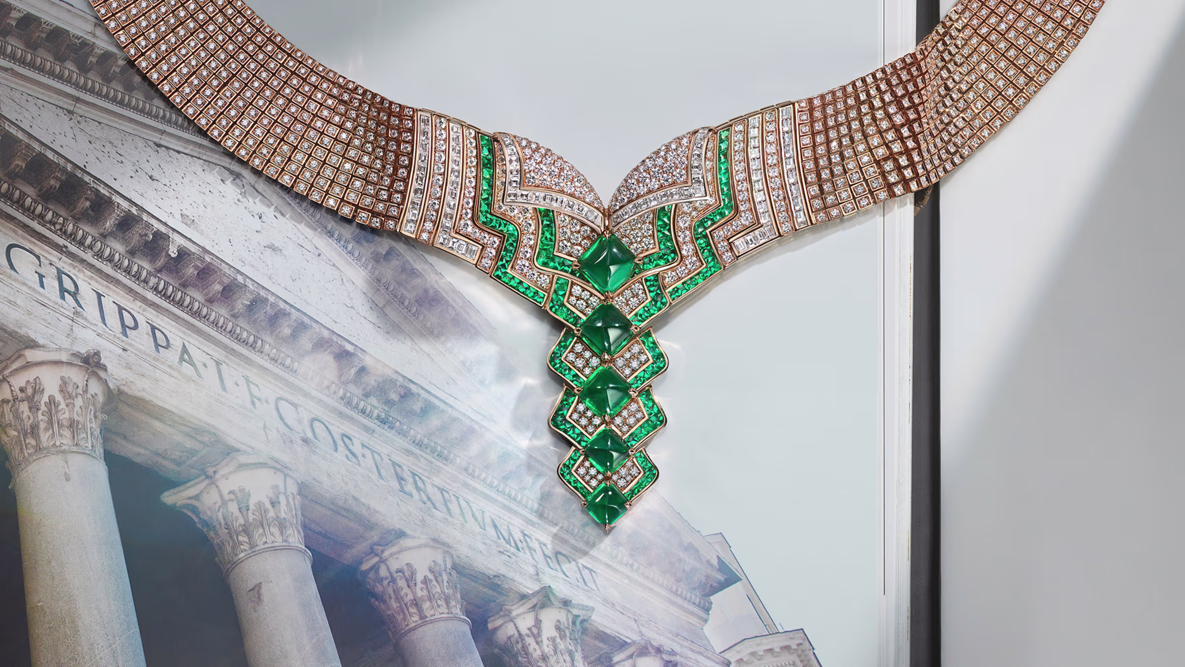 Several designs stand out as true masterpieces. The Secret Garden necklace, centred around a rare 26.65-carat Padparadscha sapphire, is a breathtaking study in colour and light, its surrounding constellation of stones creating a sense of playful movement. Equally mesmerizing are the Serpenti-inspired creations, where twin serpent heads coil gracefully around central gemstones, combining the house’s iconic motif with architectural drama. Another highlight, the Emerald and Diamond Mosaic Necklace, juxtaposes bold geometric forms with fluid lines, proving that maximalism and elegance can coexist effortlessly.