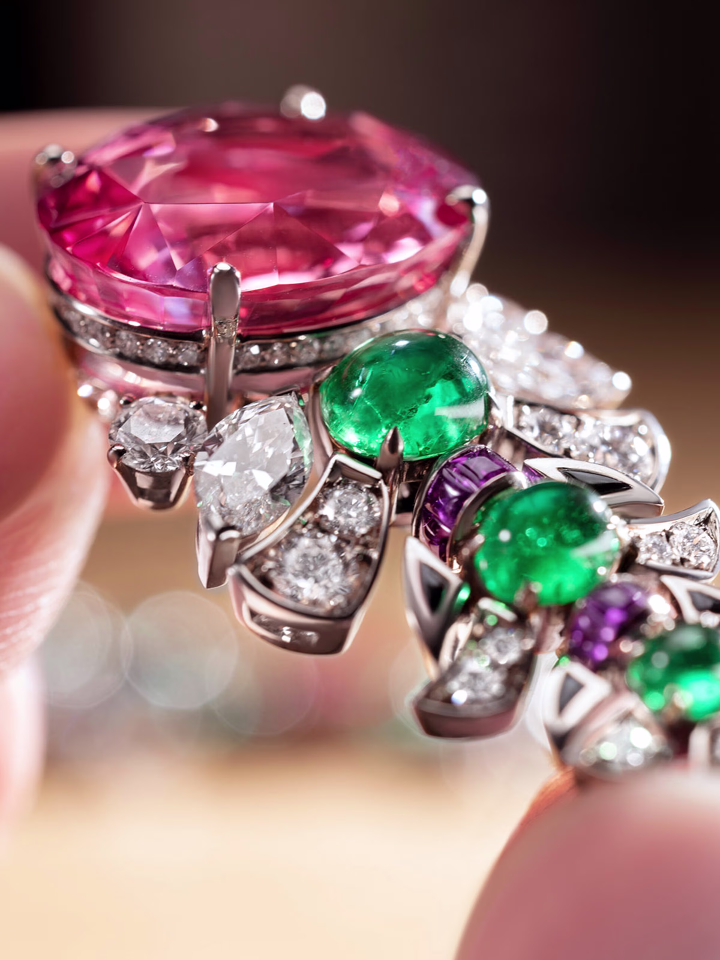 At the heart of Eclettica lies a fearless dialogue between structure and fluidity. Sculptural necklaces curve with architectural precision, while gemstones — often oversized and unapologetically vibrant — appear almost alive, shifting with an organic rhythm. Bvlgari’s mastery of colour is unmistakable: unexpected pairings of emeralds, sapphires, rubies, and rare stones form compositions that feel instinctive rather than calculated, bold yet deeply refined.