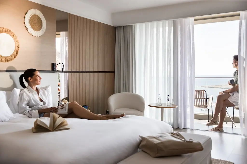 Интерьеры — воплощение современного прибрежного шика: белый, песочный, оттенки светлого дерева, льняные ткани, мягкие формы. Просторные, наполненные светом номера создают чувство умиротворения.