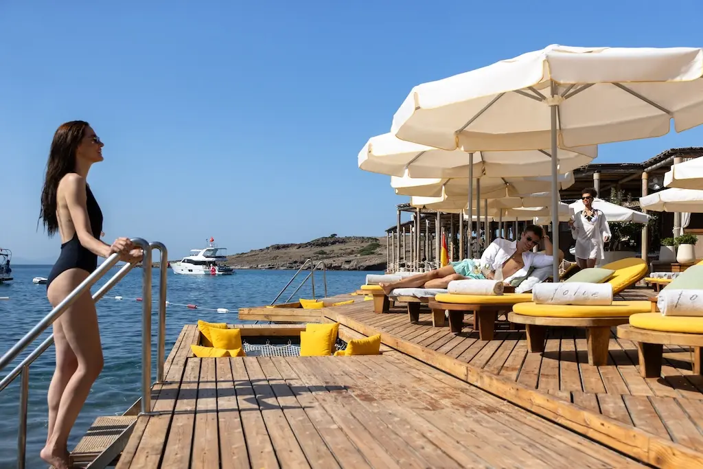 У METT Bodrum два частных пляжа — оба бесплатны для гостей и оба по-своему очаровательны. Один — тихий, созданный для тех, кто любит слушать шум волн, читать, плавать и просто позволять времени течь. Другой — более оживлённый, с атмосферой лёгкого праздника. Здесь расположен Folie Restaurant, который лучше бронировать заранее.