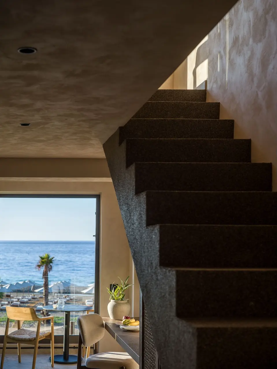 Дизайн, как выяснилось, разработан известным архитектором, автором одного из самых знаменитых курортов острова. Его почерк очевиден — минимализм, обогащённый текстурой, структурой и тонким чувством восприятия пространства. Отель одновременно современный и вне времени, с каменными элементами, светлым дубом и деликатными золотыми акцентами. Каждое пространство продумано, каждый уголок ловит меняющийся свет острова.