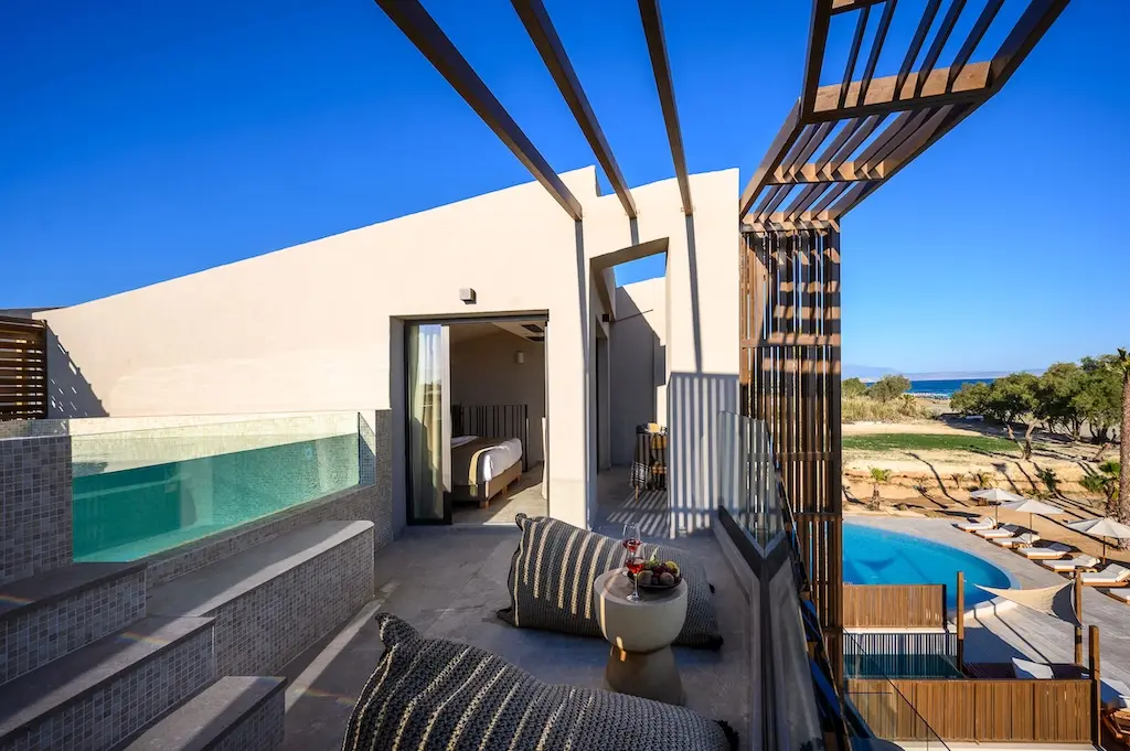 Я остановилась в Maisonette Suite, двухэтажном номере, больше напоминающем прибрежный дом, чем номер в отеле. Интерьеры были светлыми и успокаивающими, выдержанными в кремовых тонах, с элементами натурального дерева и мягкого льна, идеально перекликаясь с цветами Крита. Моя любимая деталь — джакузи на террасе с видом на бесконечное синее море — место, откуда закаты кажутся вечными.