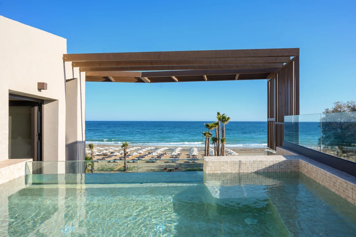 Я остановилась в Maisonette Suite, двухэтажном номере, больше напоминающем прибрежный дом, чем номер в отеле. Интерьеры были светлыми и успокаивающими, выдержанными в кремовых тонах, с элементами натурального дерева и мягкого льна, идеально перекликаясь с цветами Крита. Моя любимая деталь — джакузи на террасе с видом на бесконечное синее море — место, откуда закаты кажутся вечными.