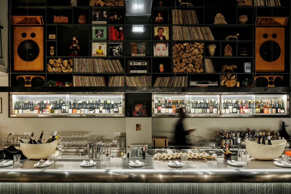 Атмосфера сочетает в себе сдержанный промышленный дизайн и ностальгический шарм. Стопки дров стоят рядом с впечатляющей коллекцией винтажных виниловых пластинок, которые проигрываются в течение всего вечера. Музыкальная программа подобрана с необычайной точностью, и тем, кто стремится к наиболее полному погружению в атмосферу, стоит занять место за барной стойкой напротив диджея и открытой кухни, где взаимодействие огня, еды и звука становится частью ритуала.