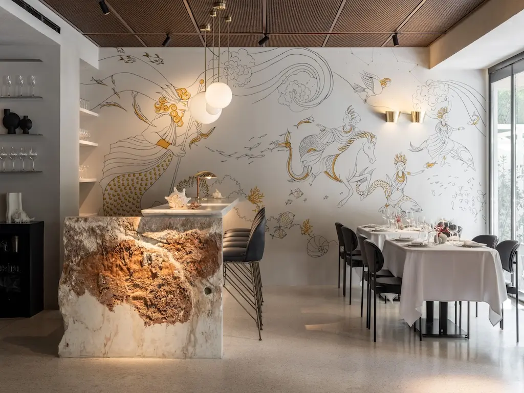 Само помещение кажется воздушным и изысканным, с мозаичными полами и произведениями искусства в морском стиле, которые напоминают о ласковых волнах и прибрежных бризах. Обслуживание отточенное, внимательное и теплое, а многие блюда демонстрируют лучшие морепродукты, добытые сезонно, и приготовленные с продуманной техникой.