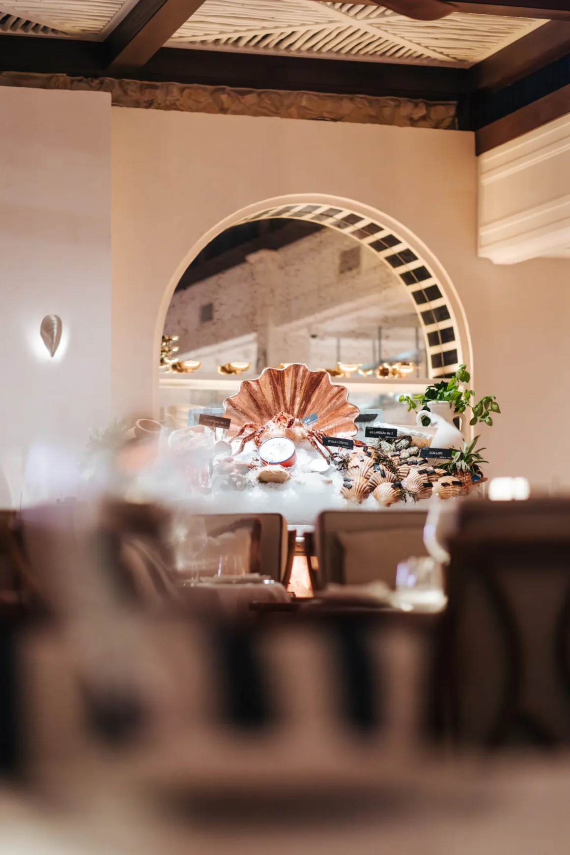 Интерьер — белые стены, мрамор, камень и атмосфера пляжного клуба Миконоса: утончённая таверна, доведённая до уровня Дубая. Можно сесть у барной стойки, заказать пару меце и наблюдать за гостями, а можно спрятаться в угловом столике с лёгким оттенком конспирации.