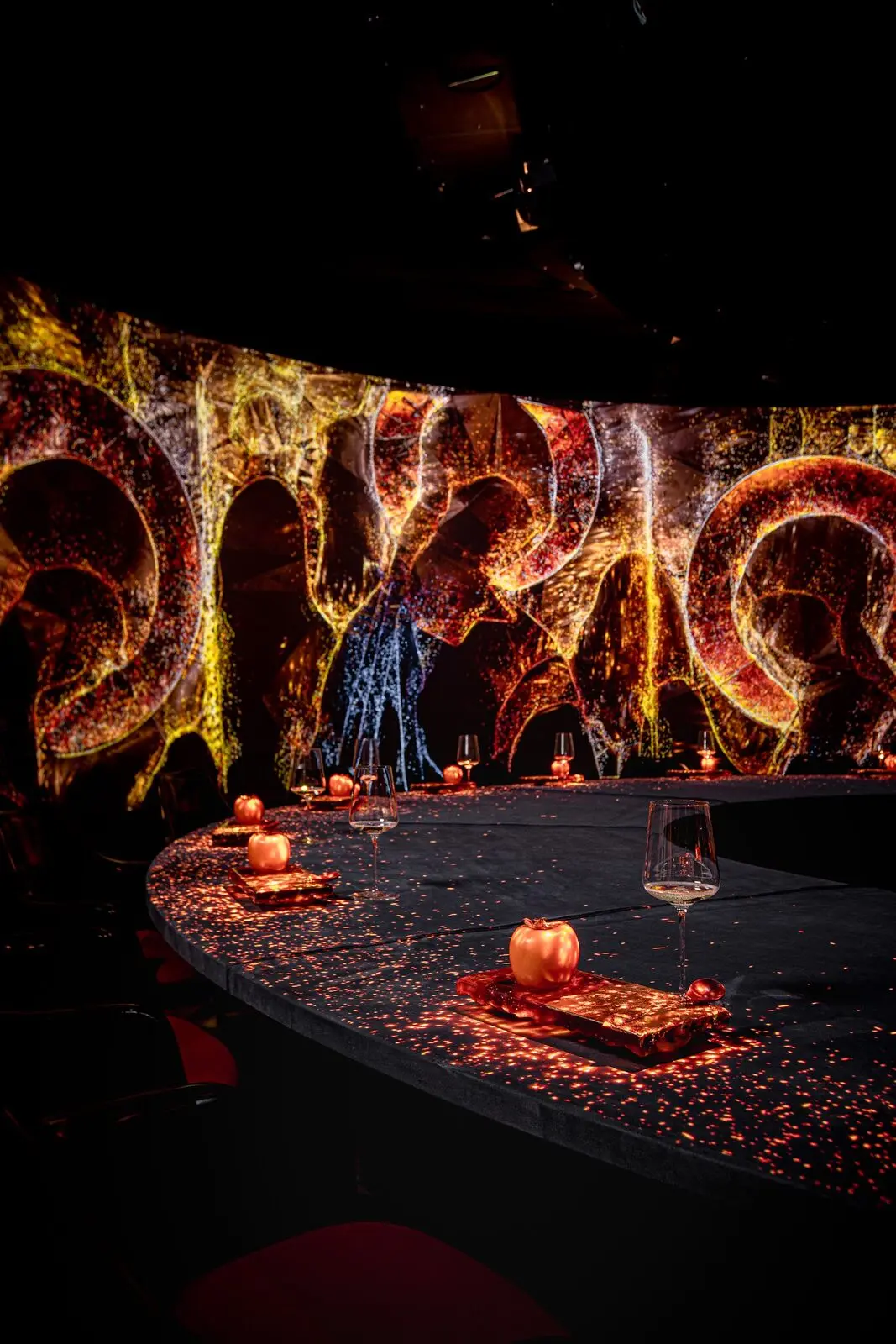 Krasota — тот ресторан, о котором мы ловим себя на мысли недели спустя: объясняем не словами, а жестами, потому что иначе не получается. Спрятавшийся в Address Downtown, он представляет собой «immersive gastro theatre» — иммерсивный гастротеатр — всего на 20 гостей, окружённых 360-градусным экраном. Каждый ужин — не просто дегустационный сет, а спектакль, который разворачивается на протяжении полутора–двух часов.