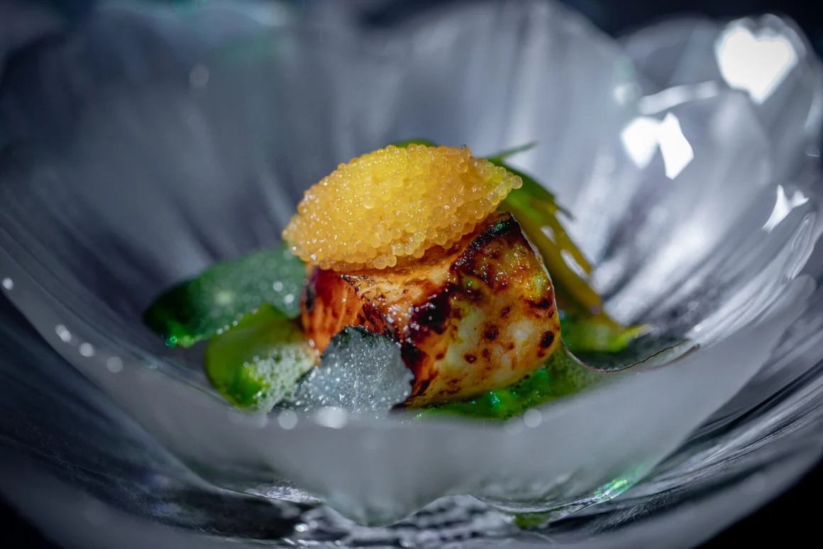 Особая магия NAHATÉ — во вселенной коллабораций. Зал выстроен вокруг первого в мире Baccarat Chef’s Table: красный зеркальный стол, украшенный легендарным хрусталём, под драматичной люстрой, где подают сет из пяти курсов и десерты haute couture от Язида. В нескольких шагах — сигарный лаундж Jacob & Co, тоже единственный в мире, добавляющий вечеру почти кинематографический уровень декаданса.