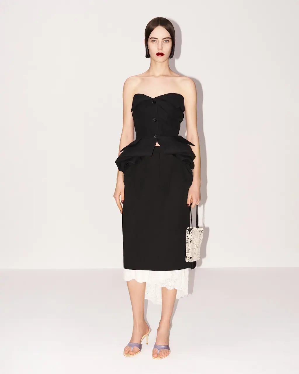 Крой остаётся предельно точным — особенно заметно в скульптурных пиджаках, топах с баской и прямых костюмах, где чувствуется кинематографичная элегантность и строгость 1990-х. Джинсовая одежда, дополненная плечиками и прямыми брюками, подчёркивает практичность и шик. Аксессуары — от лакового крокодилового клатча Brigitte до мини-сумочки с ручной кружевной отделкой — объединяют ремесленное наследие и современность. Обувь завершает образ: переработанные двуцветные туфли, атласные босоножки на среднем каблуке и остроносые модели с мини-розетками придают коллекции утончённую женственность.