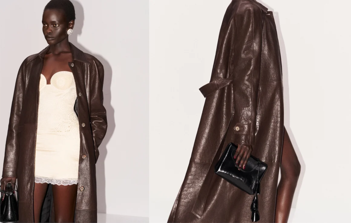 В центре внимания — верхняя одежда: широкий чёрный плащ излучает урбанистическую мужественность, а пуховое пальто как кокон, надетое поверх кружевного платья-комбинации, соединяет классику аристократического стиля с современной лёгкостью. Кожа остаётся ключевым материалом: куртка-байкер с приталенной талией, приталенный пиджак и двубортное пальто с эффектом «состаренной кожи» создают дерзкую, но утонченную эстетику, в то время как короткая кожаная куртка цвета коньяка и коричневый тренч добавляют фирменной чувственности. Даже бежевый бомбер в стиле «варсити» вносит гибкий акцент в ансамбли.